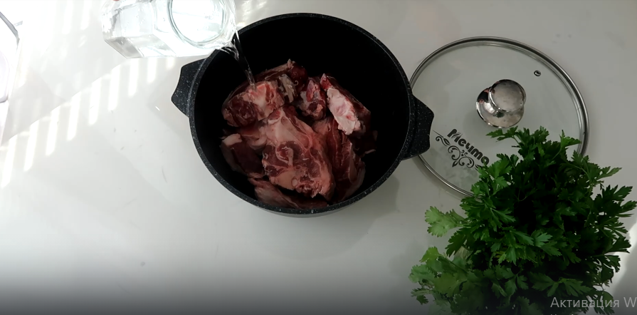 Начните с бульона: тщательно промытую баранину положите в большую кастрюлю, залейте холодной водой и поставьте на средний огонь. Дождитесь, когда вода закипит, а затем аккуратно удалите пену, которая образуется на поверхности. Добавьте пучок зелени для аромата.
