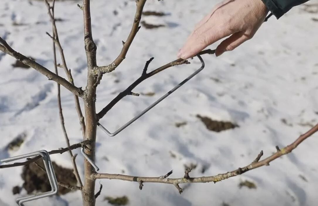 - Оптимальный угол: Ветви, отклоненные под углом 45–60°, обеспечивают укрепление скелетных ветвей и равномерное распределение питательных веществ, что способствует формированию плодовых почек.
