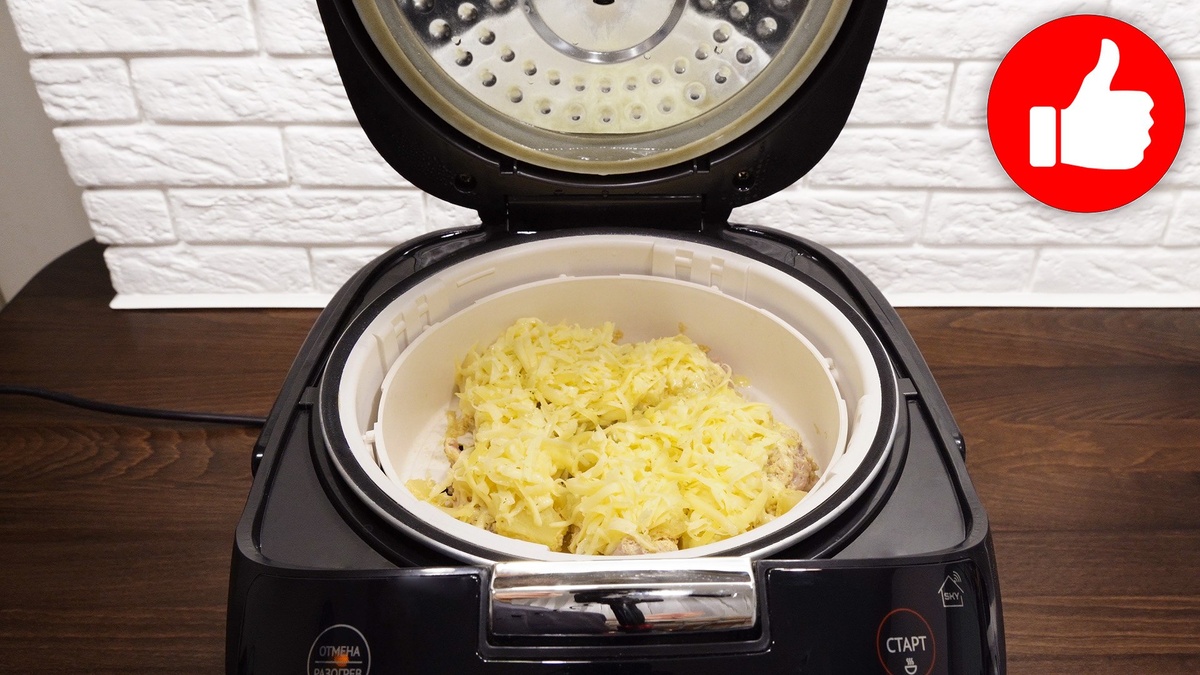 В отдельной миске подготовьте рис: промойте его под струей холодной воды, добавьте соль и залейте холодной водой. Выложите рис в мультиварку, установите корзину для пара с мясом сверху и готовьте на режиме «Рис» в течение 35 минут. В конце приготовления посыпьте горячее мясо натертым сыром и закройте крышку на 2 минуты, чтобы сыр расплавился.