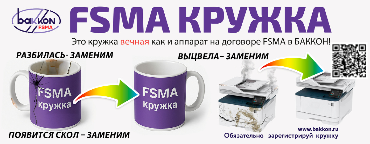 FSMA-кружка отражает суть ключевого принципа работы «Баккон»: Full Service Maintenance Agreement (FSMA), что переводится как «Договор на полное сервисное обслуживание». Суть проста: заключив соглашение однажды, можно забыть о поломках, проблемах и непредвиденных расходах. Если кружка разбилась, её просто заменят на новую — бесплатно.
