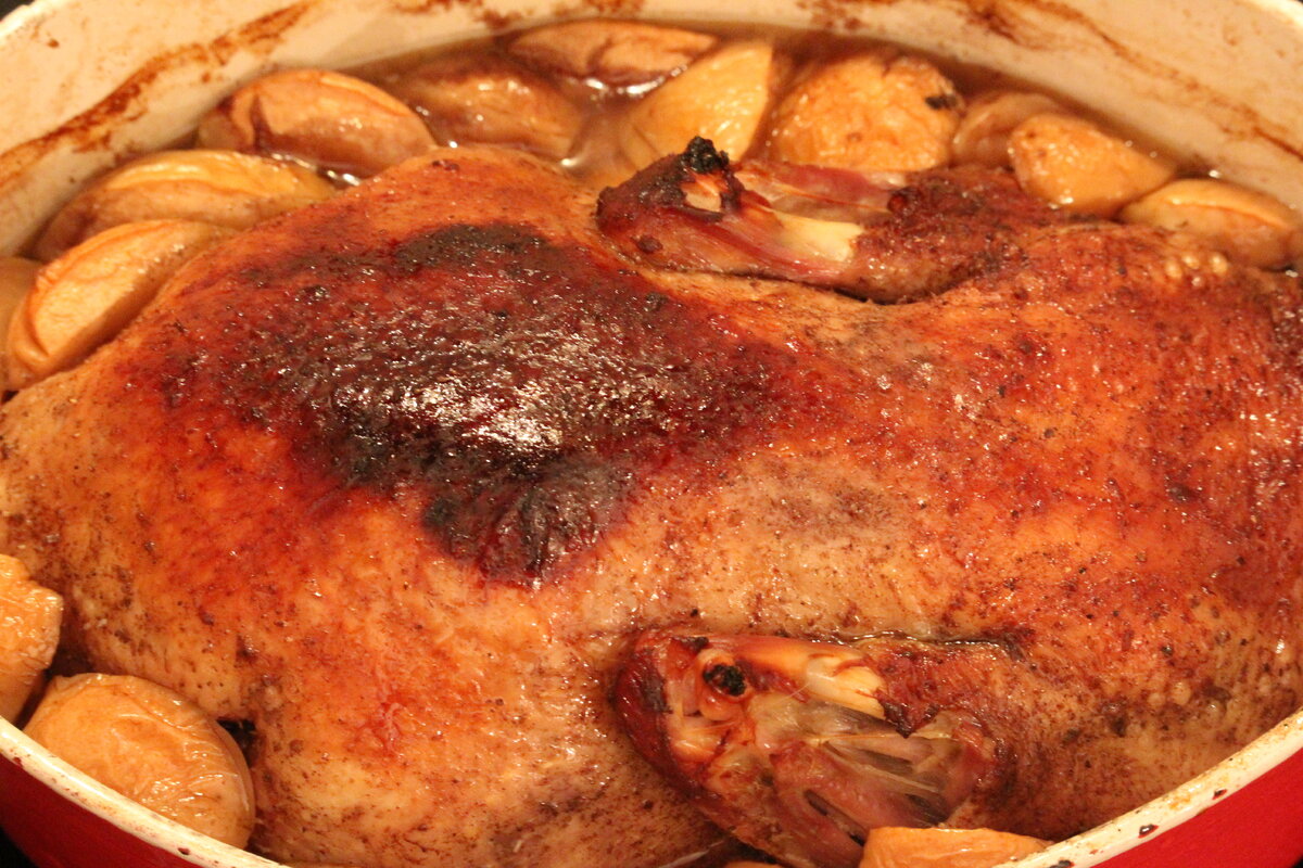 Спустя 2 часа следует добавить к утке дольки яблок и увеличить температуру до 180°C, оставляя утку без крышки на 1 час. В этот момент не забывайте время от времени поливать ее жиром для создания золотистой корочки.