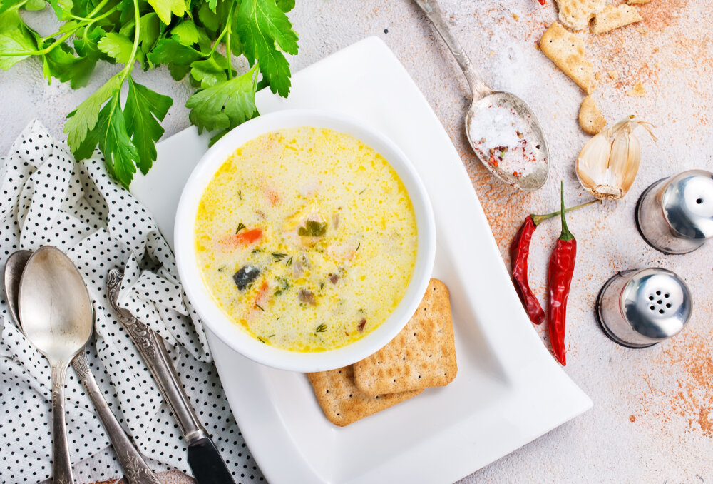 Идеальным дополнением к супчику станут гренки, сухарики или галетное печенье. Если хочется, можно превратить суп в пюре. Важно выбрать плавленый сыр без добавок и ароматизаторов, чтобы не испортить вкус.