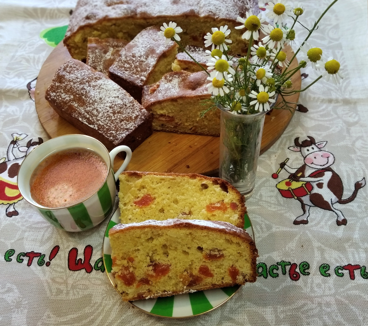 После завершения процесса выпечки можно немного посыпать готовый пирог сахарной пудрой. Однако и без этого он будет влажным, ароматным и не рассыпчатым при нарезке.