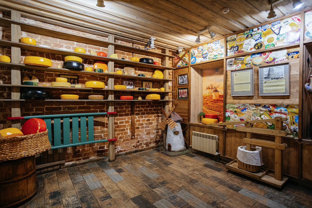 Коллекция музея включает настоящие артефакты из истории сыроварения, такие как деревянные формы для прессования, старинные сосуды для созревания и измерительные приборы. Экспозиция оформлена так, чтобы посетители могли весело провести время: здесь можно подоить «корову», поиграть в «сырные покатушки», отгадывать загадки, написанные на потолке, и даже погонять мышей.