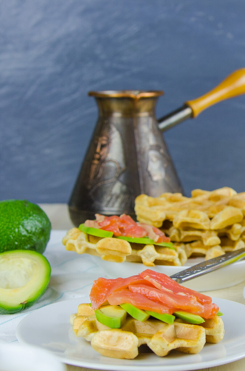 6. На готовые вафли уложить ломтики авокадо и рыбы для аппетитного завершения.