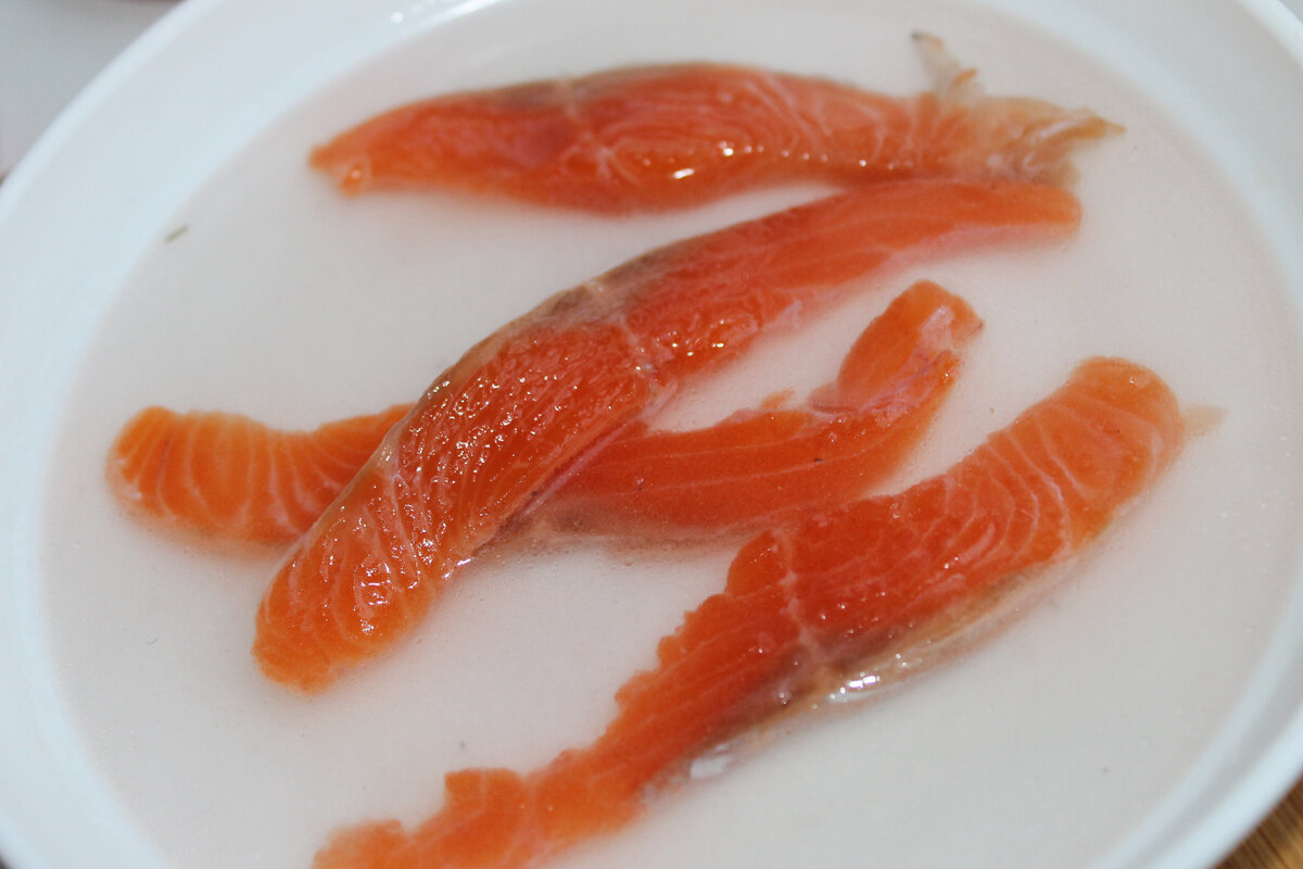 Очистив рыбу от кожицы и костей, необходимо нарезать ее тонкими слайсами. Убедитесь, что они максимально тонкие — так они идеально подходят для бутербродов. Затем пересыпьте подготовленные ломтики солью и оставьте для просолки на 5 минут перед тем, как перенести в морозильник.
