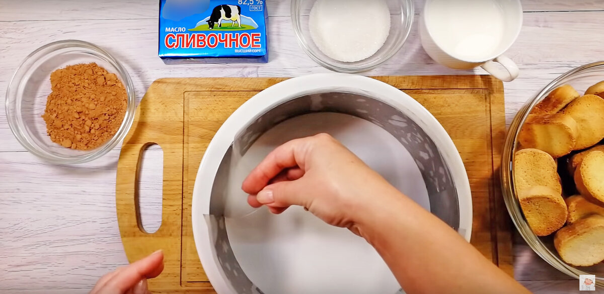 Начните с установки кулинарного кольца на тарелку, на которой будете подавать десерт. Внутренние стенки кольца стоит обернуть пленкой, а борта смазать растительным маслом для легкого извлечения готового торта.