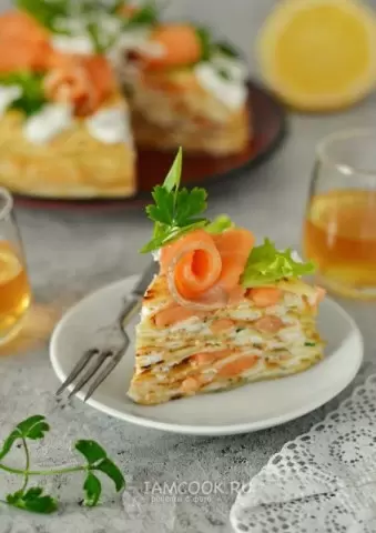 На каждом слое блинного торта наносите сыр и добавляйте немного семги, чередуя слои, пока не закончатся все ингредиенты. Важно помнить, что общее количество слоев придаст вашему торту не только высоту, но и легкость, так что не забывайте про любовь при сборке!