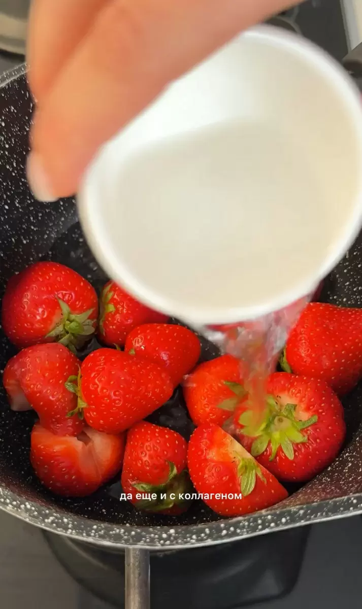 1. Подготовить клубнику: проварить ее в течение 5 минут с добавлением воды и сахарозаменителя. Если используются замороженные ягоды, время варки увеличивается до 10 минут. После этого охладить получившуюся смесь.