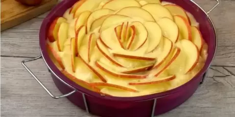 Яблоки очистите от кожуры, удалите сердцевину и нарежьте кубиками. Вмешайте их в тесто. Переложите массу в форму, предварительно смазанную маслом, и разровняйте поверхность. Чтобы придать десерту уникальный вид, яблоки можно нарезать тонкими дольками и аккуратно вдавить в тесто, создавая узор в виде розы.