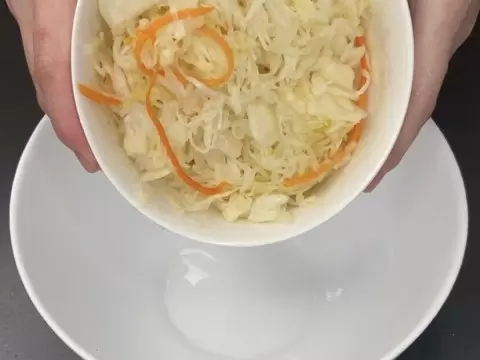 Чтобы сделать этот салат, лучше всего использовать домашнюю квашеную капусту. Просто выкладываете ее в салатник.