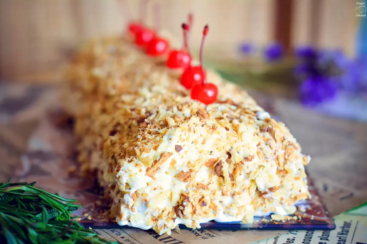 Накройте стол пленкой в три слоя. Выложите на пленку несколько ложек крема и распределите его равномерно. Сверху раскладываются шесть полосок теста, затем снова крем, и порезанный на кусочки банан. Так формируете торт, полностью покрываете его кремом и аккуратно сворачиваете в форме полена. Заверните концы пленки и отправьте торт в холодильник на несколько часов, чтобы он застыл.