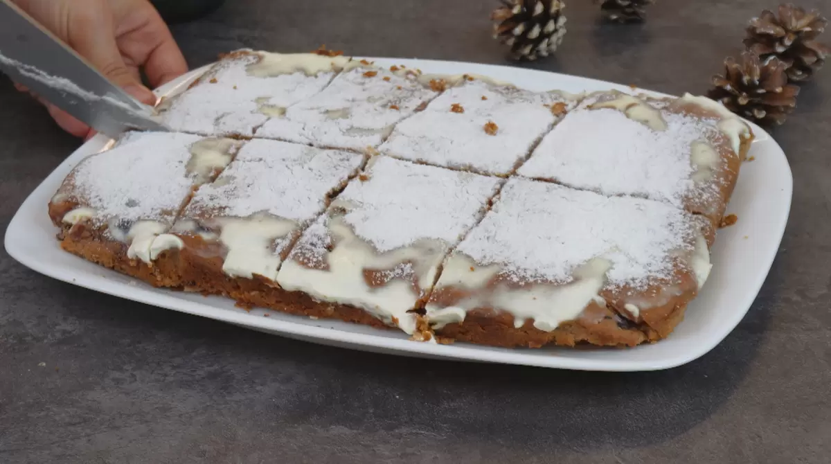 По окончании выпечки, смазать горячий пирог сметаной и дать настояться 10 минут. Завершить процесс, присыпав сахарной пудрой. Десерт готов, и его можно смело подавать к столу!