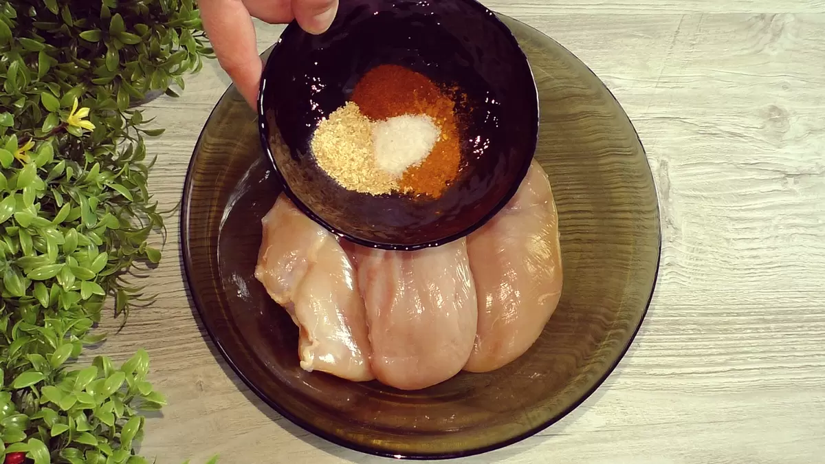 Сначала следует тщательно промыть куриное филе и обсушить его. Для удобства обработки можно оставить малое филе на большом, а просто убрать ненужные элементы. Солить стоит, учитывая, что в некоторых приправах уже может содержаться соль. В этом случае лучше положить её меньше. Затем натрите филе смесью специй, включая сушёный чеснок и паприку.