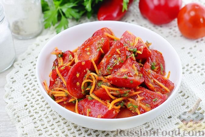 - Закуска из помидоров и моркови по-корейски: Необычное сочетание томатов и моркови с горчичным соусом и чесноком оставит незабываемые впечатления у всех, кто их попробует.