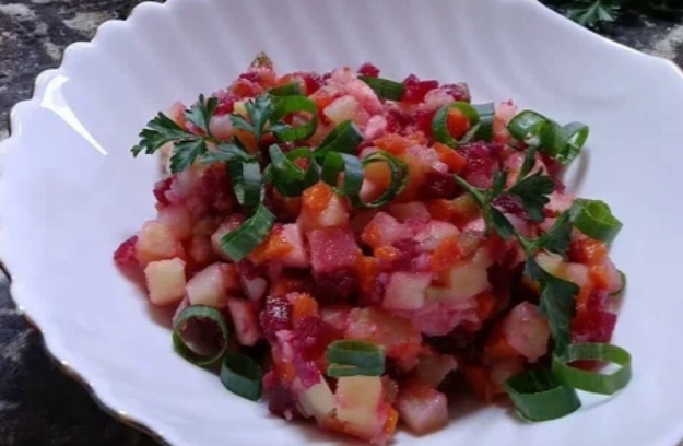 Винегрет с яблоками и капустой — это современная интерпретация традиционного салата, где квашеная капуста и зелёные яблоки добавляют уникальную текстуру и гармоничный кисло-сладкий вкус. Яблоки уравновешивают сладость свёклы и картофеля, а квашеная капуста придаёт блюду тонкий но яркий вкус.