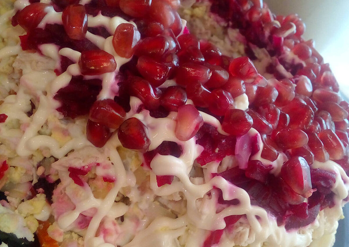 После того как стакан убран, верх салата обильно смазывается майонезом и украшается зернами граната.