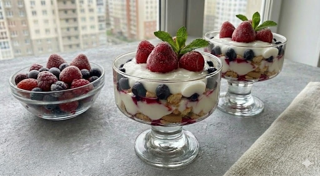 Последний штрих — снова немного поломанных печенек поверх ягод, и завершить все следует оставшимся йогуртом.