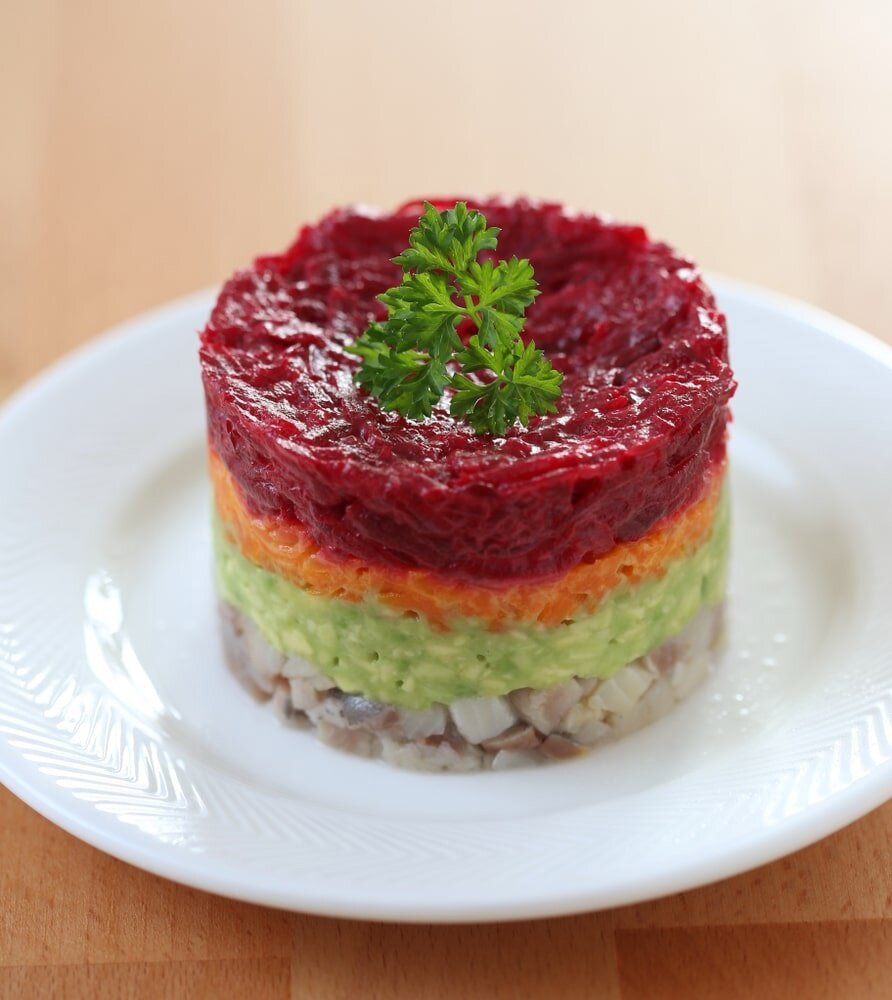 Первым слоем выкладывается сельдь, затем идет авокадо.