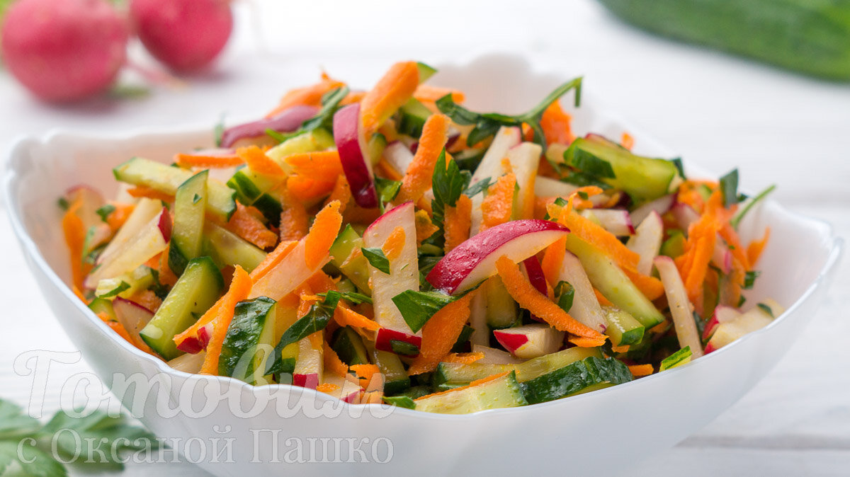 Этот красочный овощной салат, состоящий из огурцов и редиса, идеально подходит для повседневного меню. Уникальное сочетание свежих ингредиентов, включая морковь и зелень, делает его отличным гарниром к мясу или основным блюдам. Он не только вкусный, но и ароматный, чего так не хватает в суете повседневной жизни.
