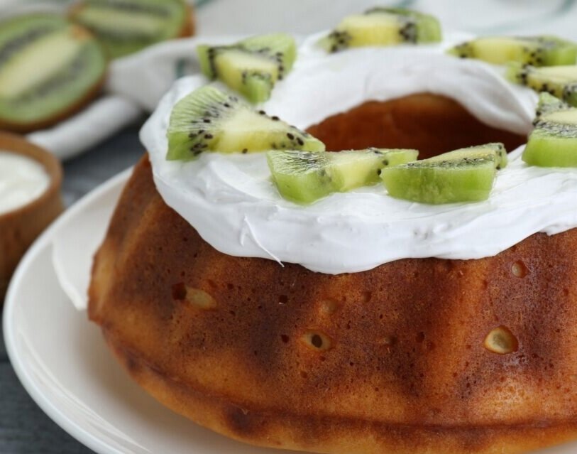 Для украшения взбить холодные сливки с сахарной пудрой до устойчивых пиков, затем покрыть остывший пирог и украсить ломтиками киви.