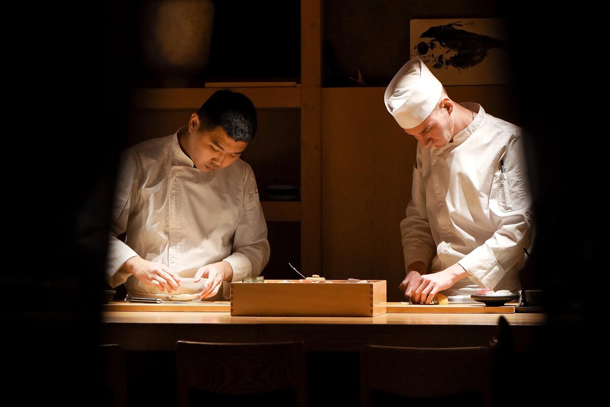 Что особенного: Ужин в формате омакасе на 20 курсов проходит непосредственно за суши-стойкой. Гостям предлагается наблюдать за мастерством поваров и пробовать авторские блюда из свежих морепродуктов, в том числе гребешков из Сахалина с осетровой икрой и сибаса с кацуобуси. Саке-пейринг разнообразен: от традиционного до игристого.