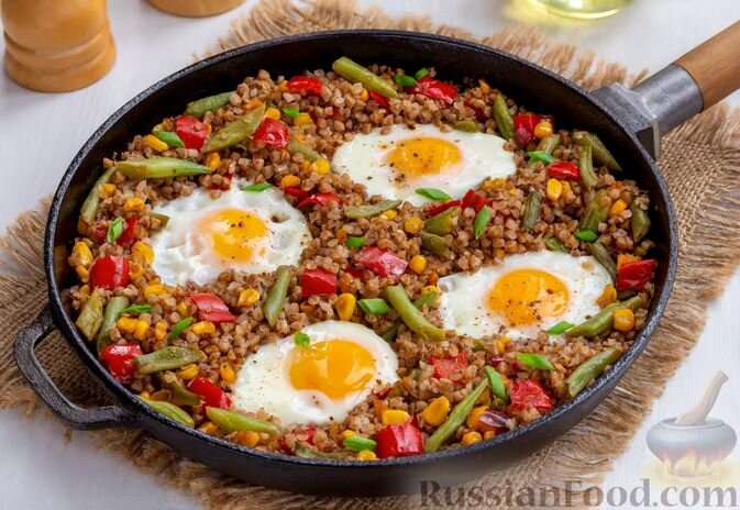 Для любителей сытной и яркой кухни предложим гречку с стручковой фасолью, болгарским перцем и кукурузой. Это блюдо можно делать как с свежими, так и замороженными овощами. При подаче с глазуньей, желток добавит нежности и сделает блюдо более питательным и аппетитным.