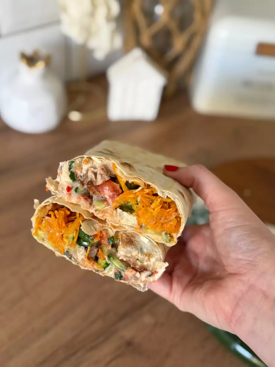 Теперь приходит время завернуть шаурму. Сначала аккуратно накрываем начинку сверху, затем подгибаем края лаваша и скатываем в рулет. Правильное сворачивание — залог того, что начинка не выльется во время поедания.