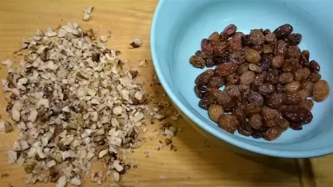 Для начала, изюм следует промыть и замочить в воде на некоторое время, после чего откинуть на дуршлаг. Грецкие орехи необходимо мелко нарубить. Затем в глубокой миске смешиваются растительное масло, мед, соль и корица. Всё это надо тщательно перемешать до однородной массы.