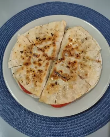 Петрушка нарезается, помидор — кружочками, лук — колечками, а корнишоны — тонкими пластинами. Тортилью смазывают майонезом и укладывают на одну половину слой из помидоров, лука, корнишонов и кукурузы, посыпая кинзой. Затем лепёшку складывают пополам и обжаривают на гриле или сковороде, подавая с соусами гуакомоле и пико-де-гайо.