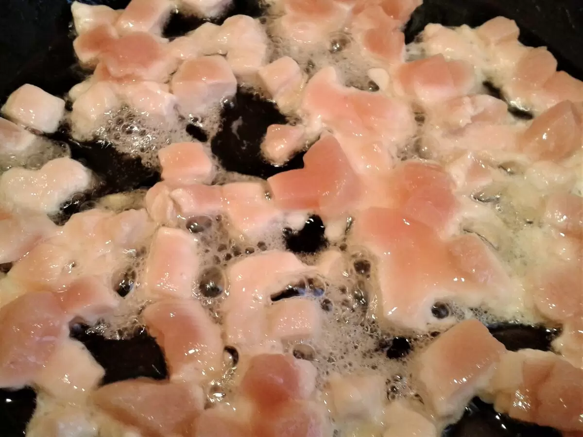 2. Куриное филе нарежьте кубиками и обжарьте на растительном масле до легкой золотистости.