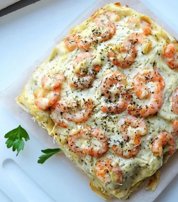 3. **Сборка лазаньи**: Листы лазаньи окуните в тёплую воду на 2–3 секунды. На двойной лист пергамента выложите два листа лазаньи горизонтально, намажьте соусом, уложите часть начинки, посыпьте пармезаном и накройте двумя смоченными листами лазаньи вертикально. Завершите сборку, накрывая соусом и украсив креветками, добавив сверху пармезан.