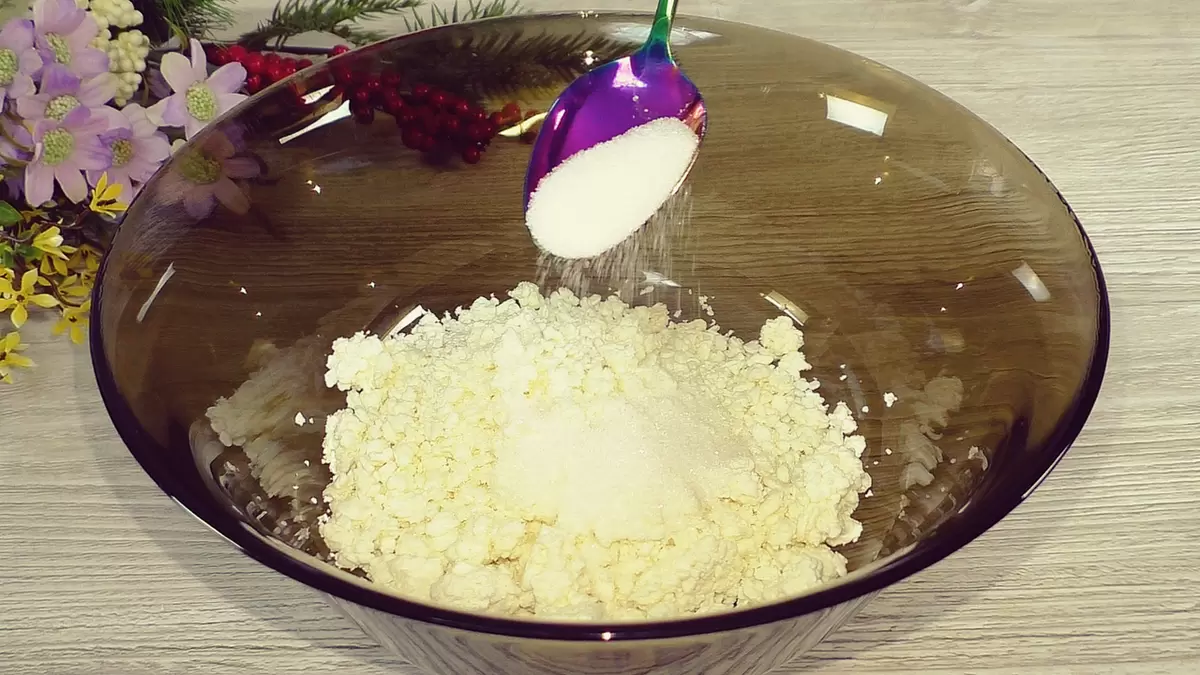 1. В удобной ёмкости смешать творог с щепоткой соли и сахаром. Количество сахара можно отрегулировать в зависимости от личных предпочтений. Для сладковатого вкуса отлично подойдут 3 столовые ложки.