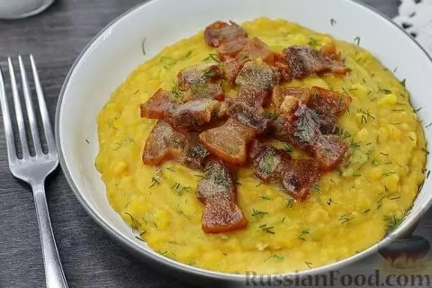 - Гороховая каша со шкварками. Это простое, но очень сытное блюдо часто забывается. Скромную гороховую кашу можно обогатить вкусом, добавив хрустящие шкварки и свежий укроп. В результате получится нежное и ароматное угощение, которое отлично подойдет к любому мясному гарниру.