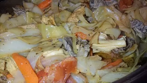 К луку и курице добавляют капусту и помидор. Смесь тушится под крышкой на среднем огне около 15 минут с периодическим помешиванием.