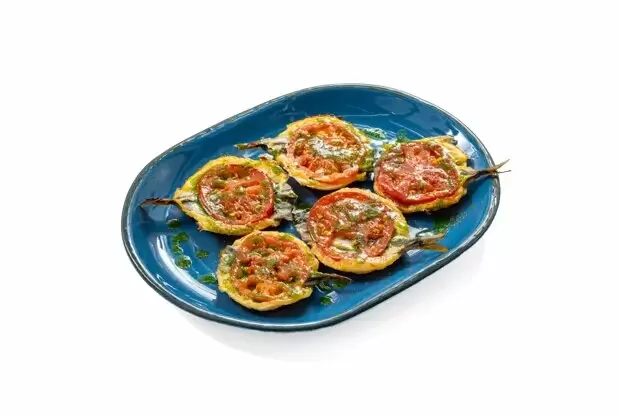 Что касается мойвы, то ее необходимо выпотрошить и удалить хребет, сохранив целостность рыбки – это важно для презентации. После этого мойву стоит обсушить и выложить на каждый кружок помидора.