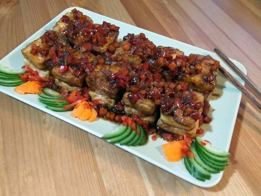 - Вынуть тофу на тарелку, а оставшийся соус выпарить до нужной консистенции и полить сверху на тофу. Блюдо готово к подаче!