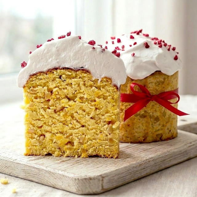 Готовые куличи следует накрыть полотенцем для охлаждения. В это время можно приготовить глазурь, взбив белок с лимонной кислотой и эритритом до получения плотной воздушной массы. Глазурь следует нанести на остывшие куличи и украсить цветной посыпкой.