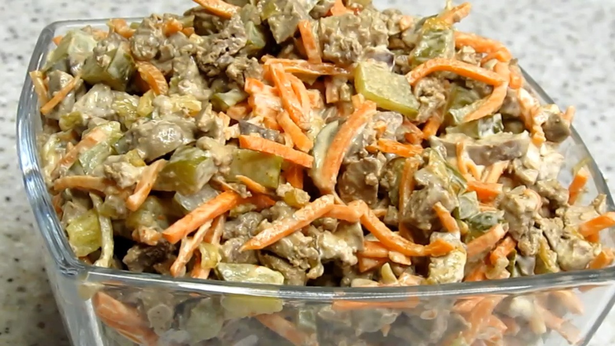 После того как печень остынет, её следует нарезать небольшими кусочками и соединить с обжаренными луком и морковью, предварительно удалив лишнее масло. Затем добавьте нарезанные маринованные огурцы, которые придадут салату особый вкус.